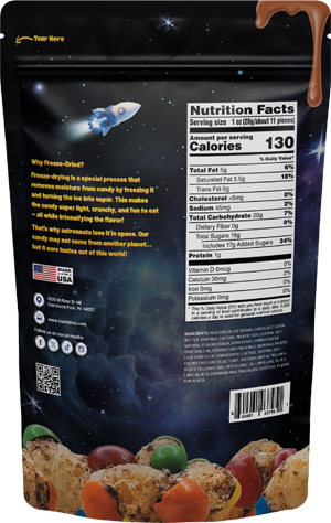 Caramel Mini Meteors are freeze-dried versions of a beloved caramel-filled candy, offering a unique crunchy texture with a rich caramel flavor.
